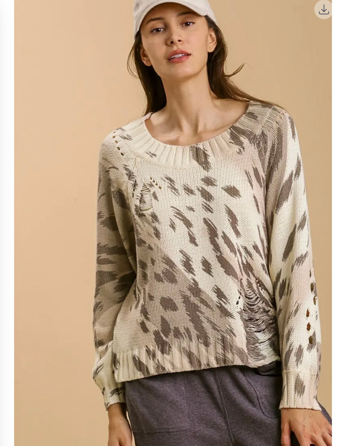 Wild meets cozy in this round-neck knit pullover featuring a bold, yet muted animal print and subtly distressed details. Designed with a relaxed fit and finished with a ribbed hem and cuffs for that effortlessly undone edge.