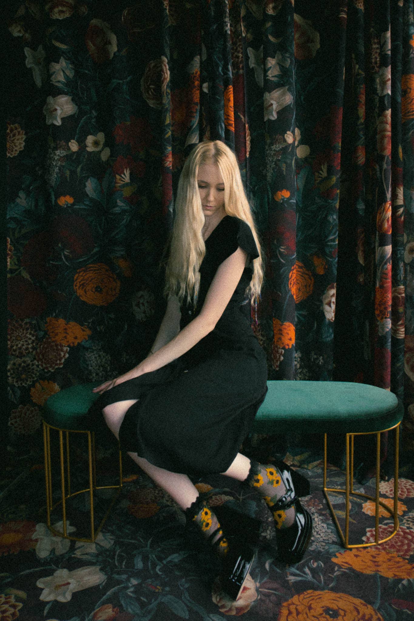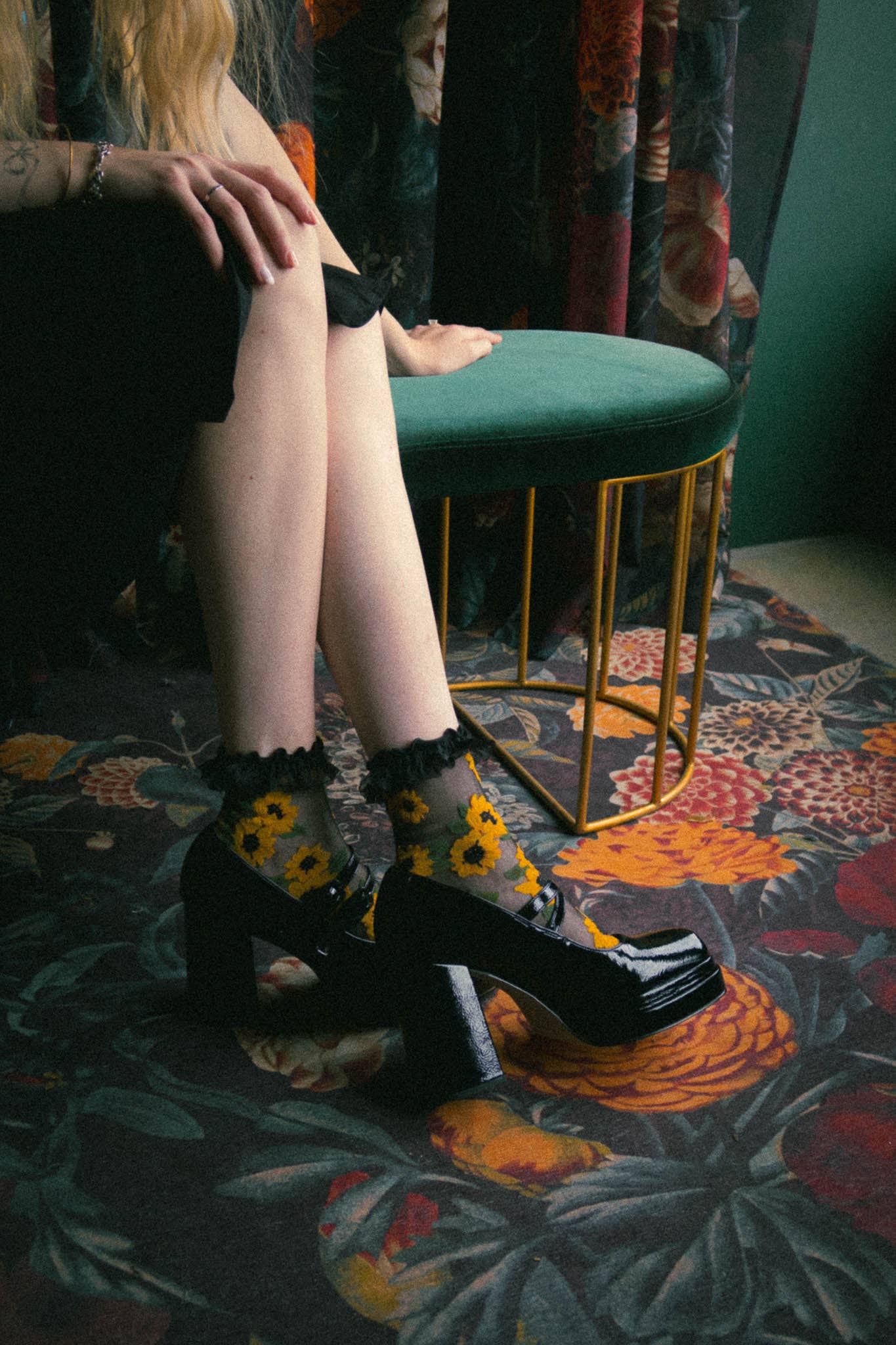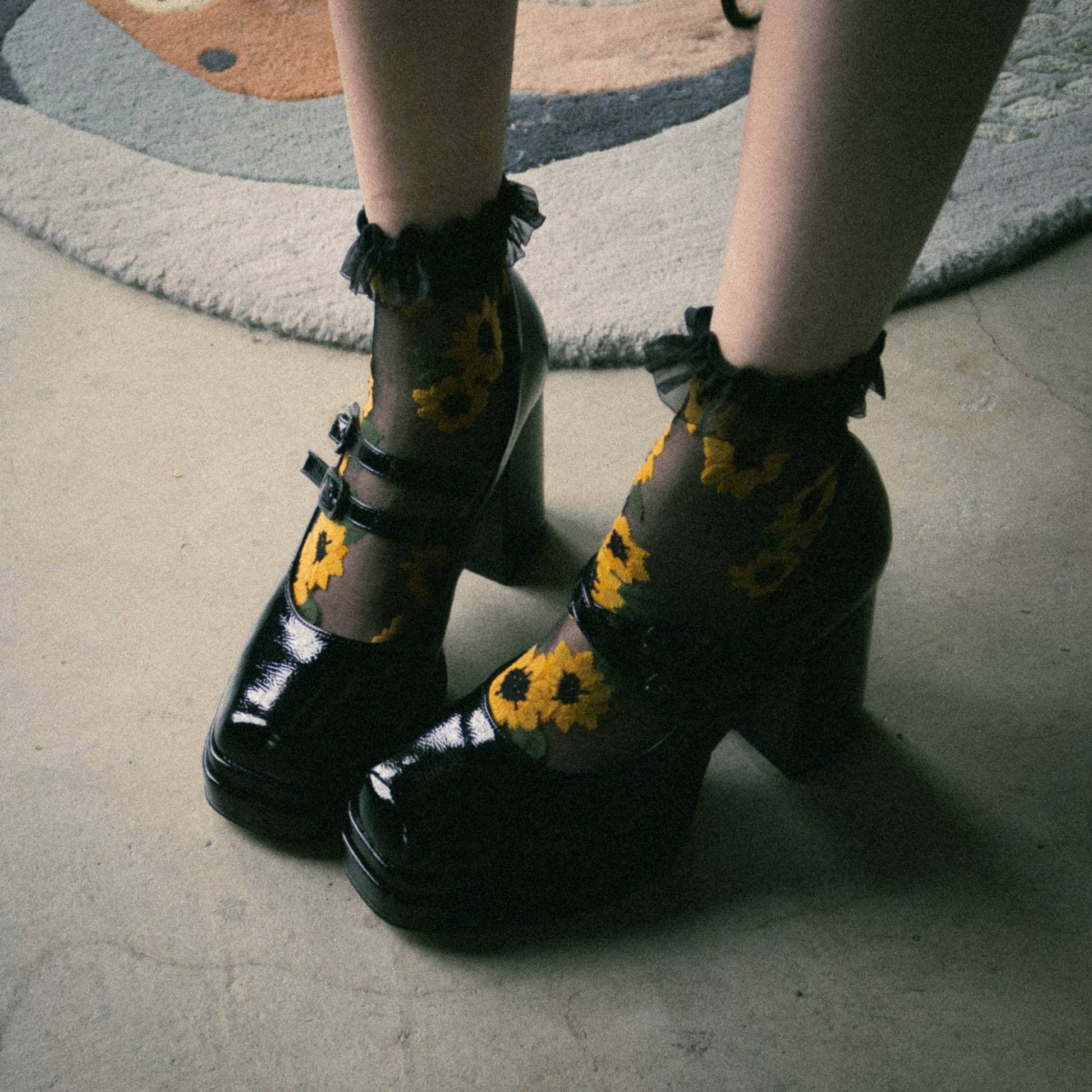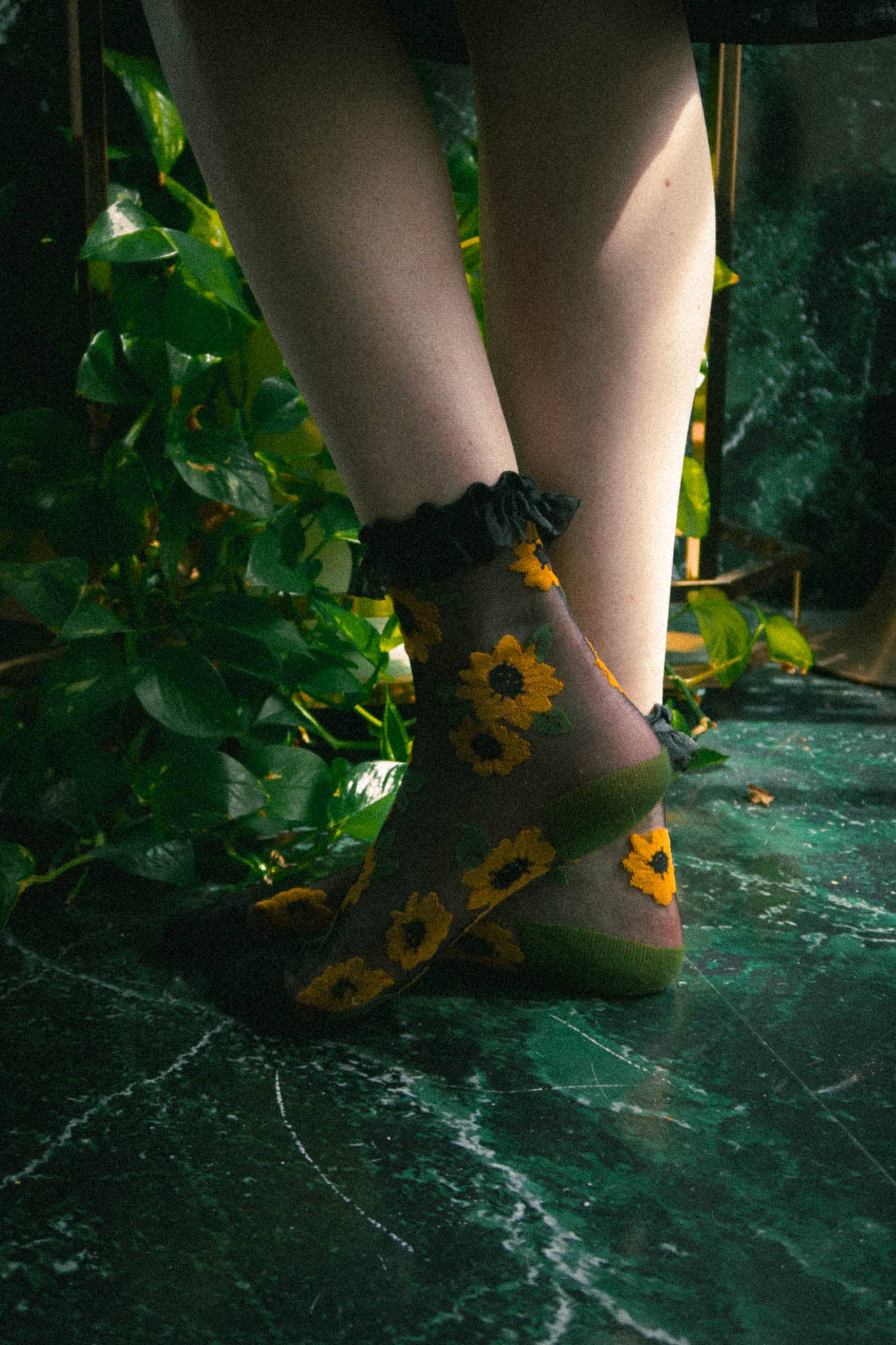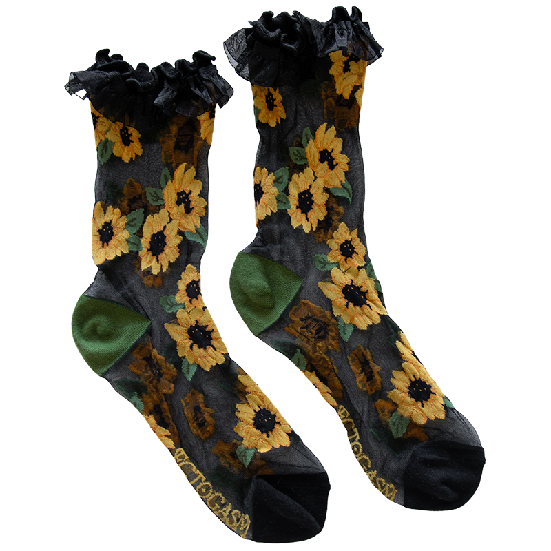 Sheer black socks with woven cotton design. - Unisex. One size fits most. - Quite durable! These socks only look delicate. - Reinforced heel and toe. Cotton on bottom for comfort. - Hand wash cold. Hang Dry. - 40% cotton, 55% polyester, 5% spandex. - Lace ruffle detail on top. Cadmium yellow sunflowers dance on a sheer veil of black. Topped with a lace ruffle, these truly unique socks are designed to stand out.