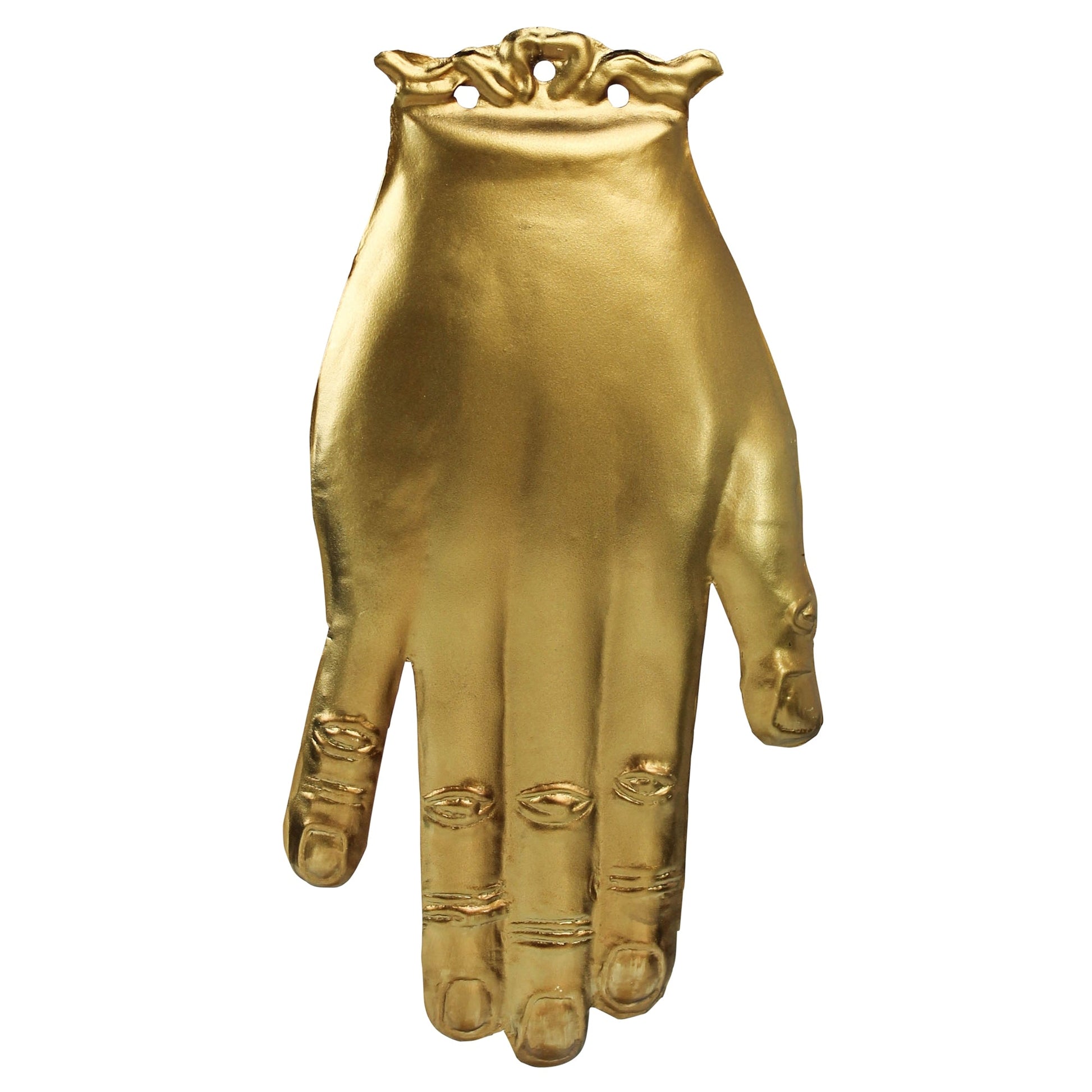 This folk art relic is made of pressed metal with a brass finish. The hand Milagro symbolizes comfort, creation, strength and friendship.