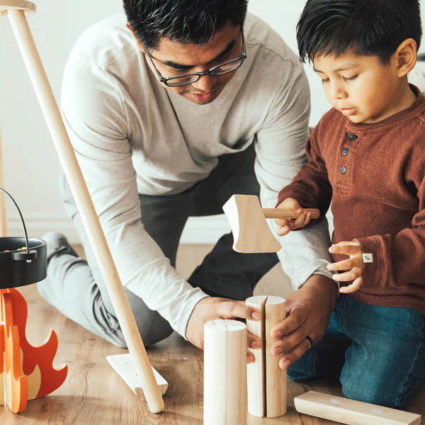 - Complete pioneer set: wooden pot, corn cobs, hot dogs, fish, campfire, logs & splitting axe for rich storytelling.