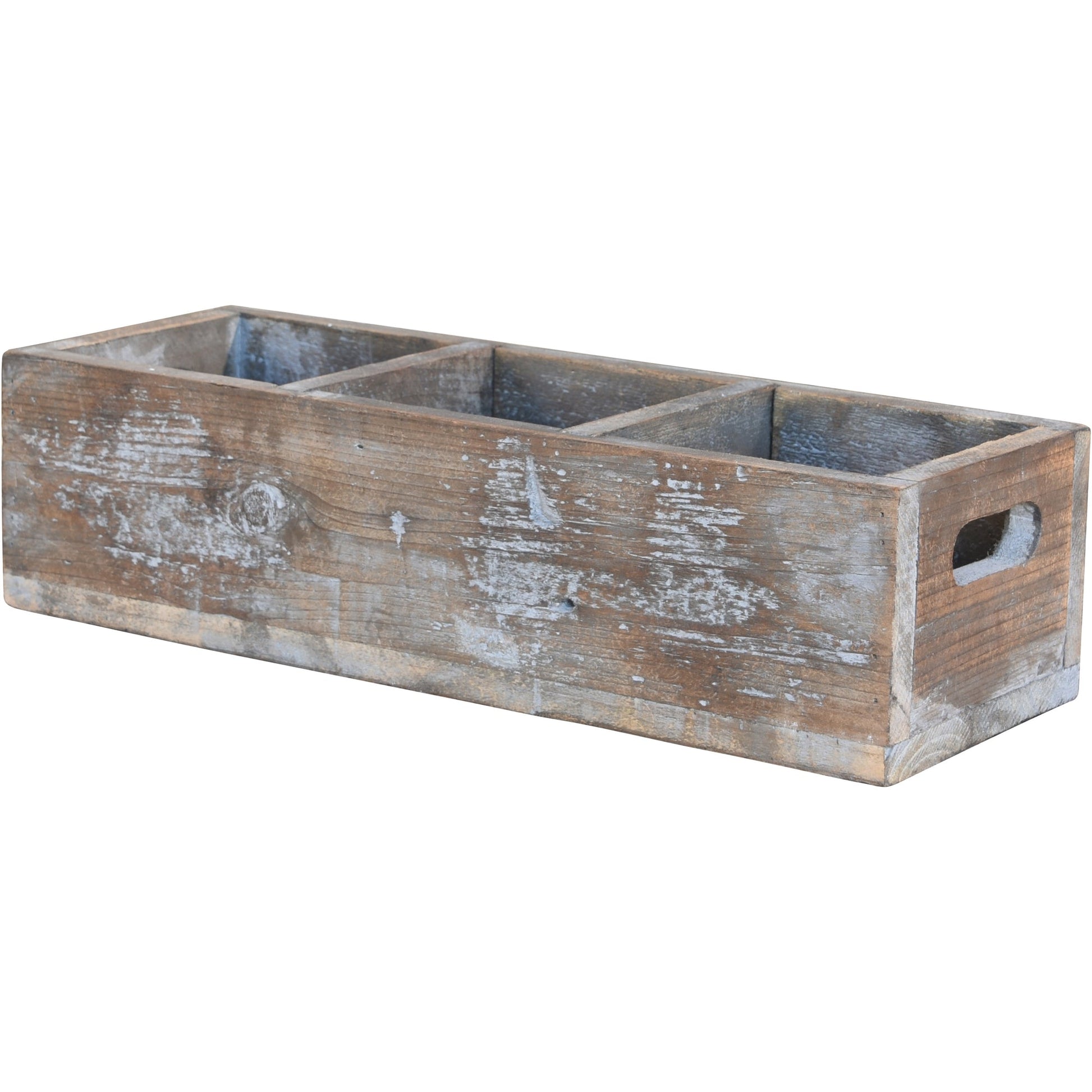 Our rustic wood crate has three compartments to fit 4"growers-pots, garden tools or any other gardeners supplies and may easily be toted about by the handles on either side.