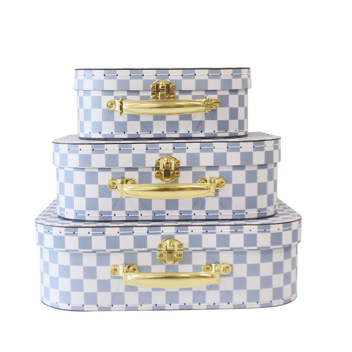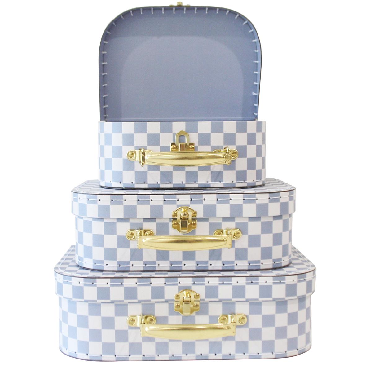 Gorgeous blue check 3-piece-set of suitcases. Perfect for decor or play time!